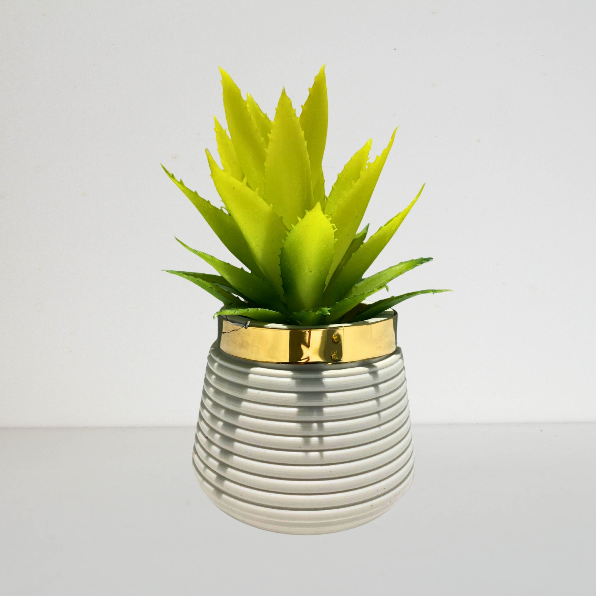 Add a touch of green to your space with this Mini Aloe Decor Vase. Featuring realistic aloe leaves in a stylish ribbed ceramic pot with a golden rim, it's a low-maintenance accent for desks, shelves, or countertops